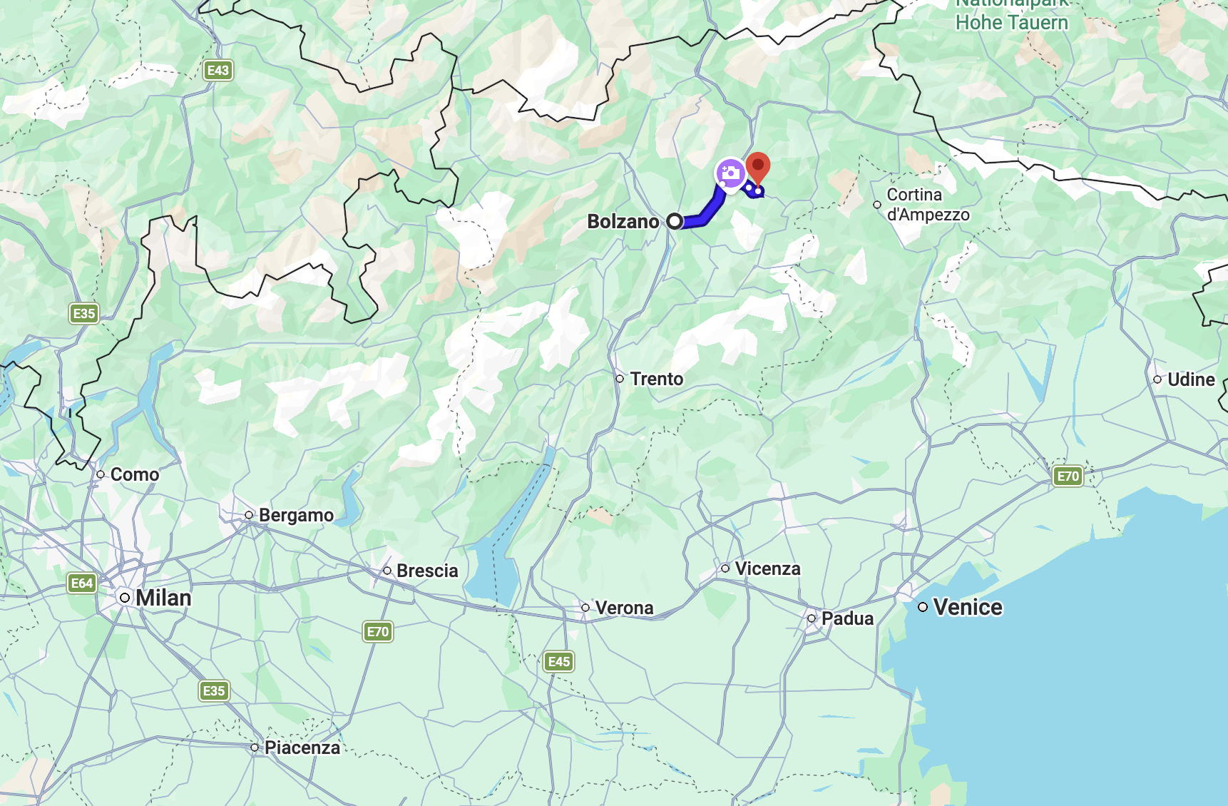 On that Fall trip, i drove from Innsbruck, Austria, to Lake Braies, then to Cortina d’Ampezzo, then to Tre Cime. You can see this route is along the Eastern side of the Dolomites.
