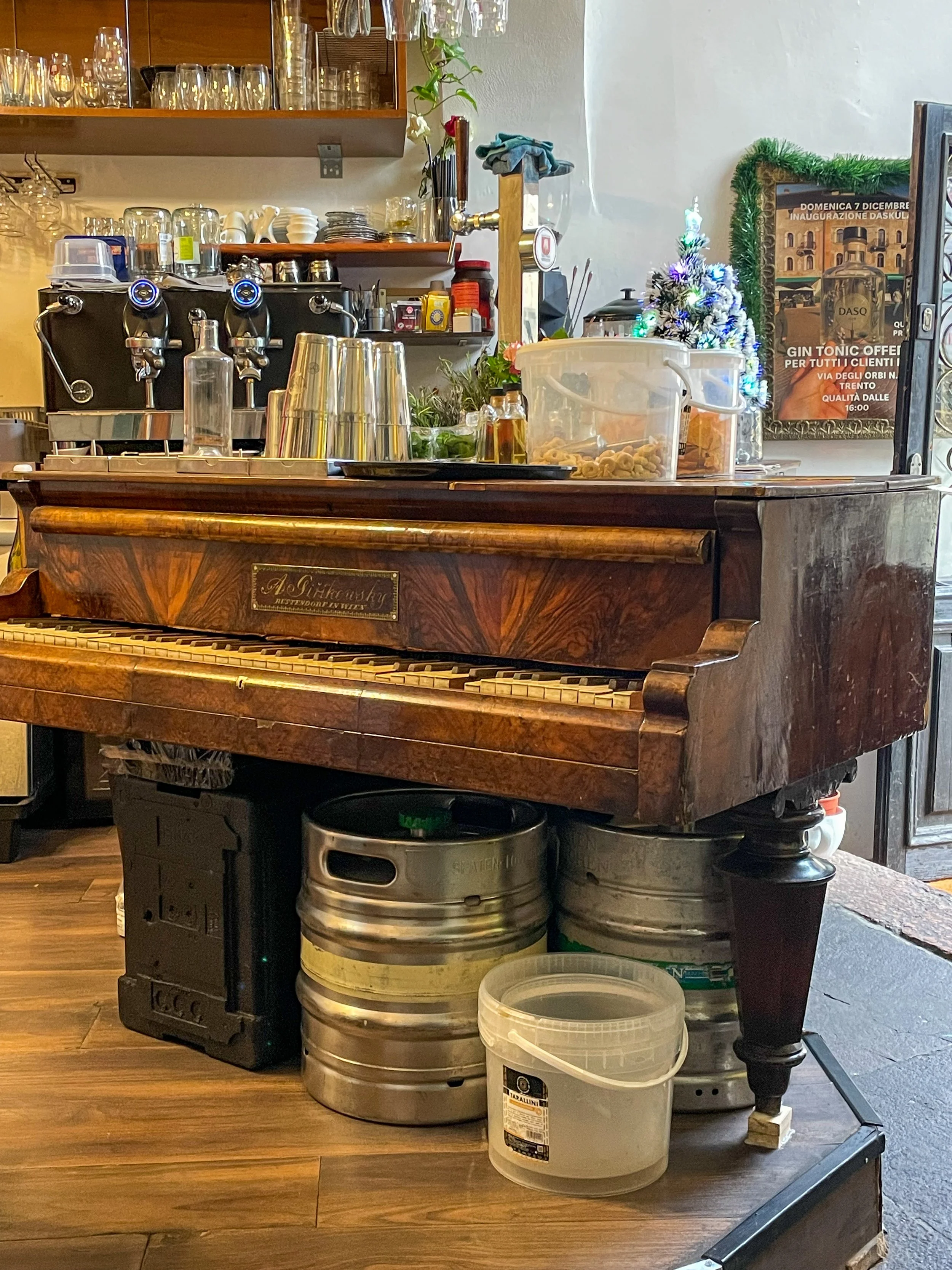We kept seeing the promise of “fluffy pancakes” as we traveled around, but they were elusive! Even if they were listed on the Google Maps reviews, it didn’t always mean they were currently available. We finally tracked them down at a hole-in-the-wall spot in Trento called FC Dasklub. The venue appeared to be a nightclub by night and a fluffy pancake procurer by day, which seemed like a strange combination, but the pancakes were delicious. The spot featured a grand piano as a storage unit, which we had mixed feelings about.